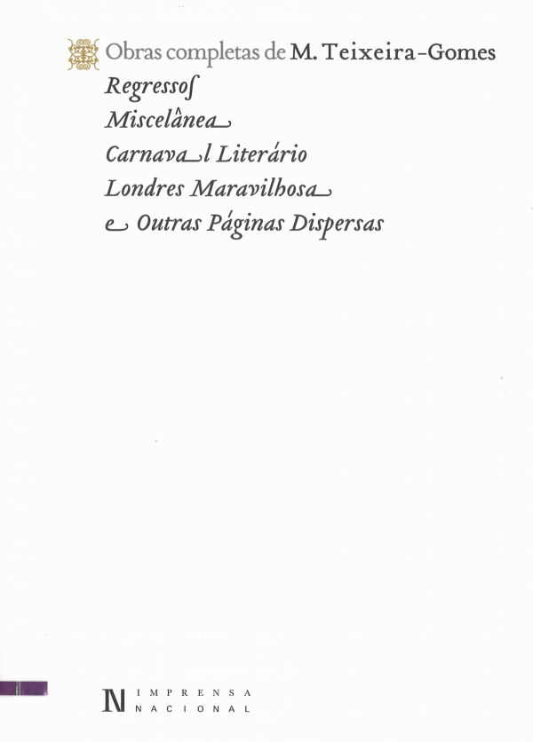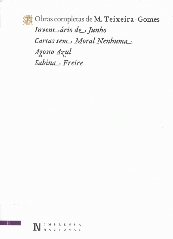 Vol. 1: Com coordenação de Nuno Júdice e José Alberto Quaresma, a nova edição da coleção «Obra Completa de Manuel Teixeira Gomes» resgata a produção literária de um homem fascinante e culto, um autor dotado de um olhar peculiar sobre a sociedade do seu tempo, e cuja vida teve tanto de fascinante como de controverso.