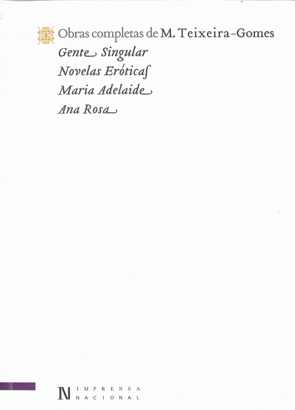 Vol. 2: Neste segundo volume reúnem-se quatro obras que correspondem ao conjunto mais significativo da segunda parte da obra literária de M. Teixeira-Gomes. Gente Singular foi publicado em 1909, no final da monarquia portuguesa. Novelas Eróticas foi publicado em 1935, Maria Adelaide em 1938 e Ana Rosa em 1941 e estas últimas três obras representam os últimos anos da produção literária deste autor.